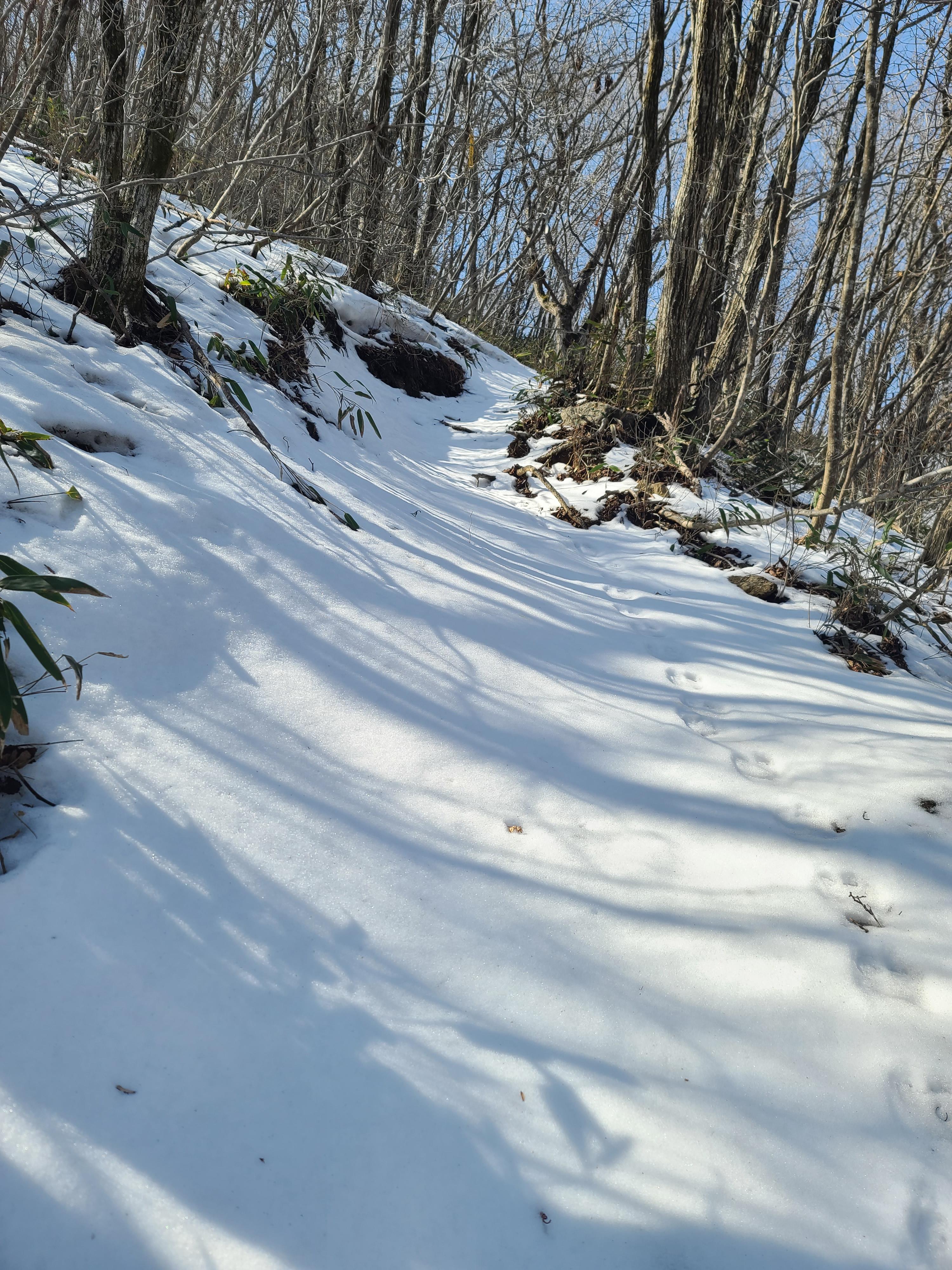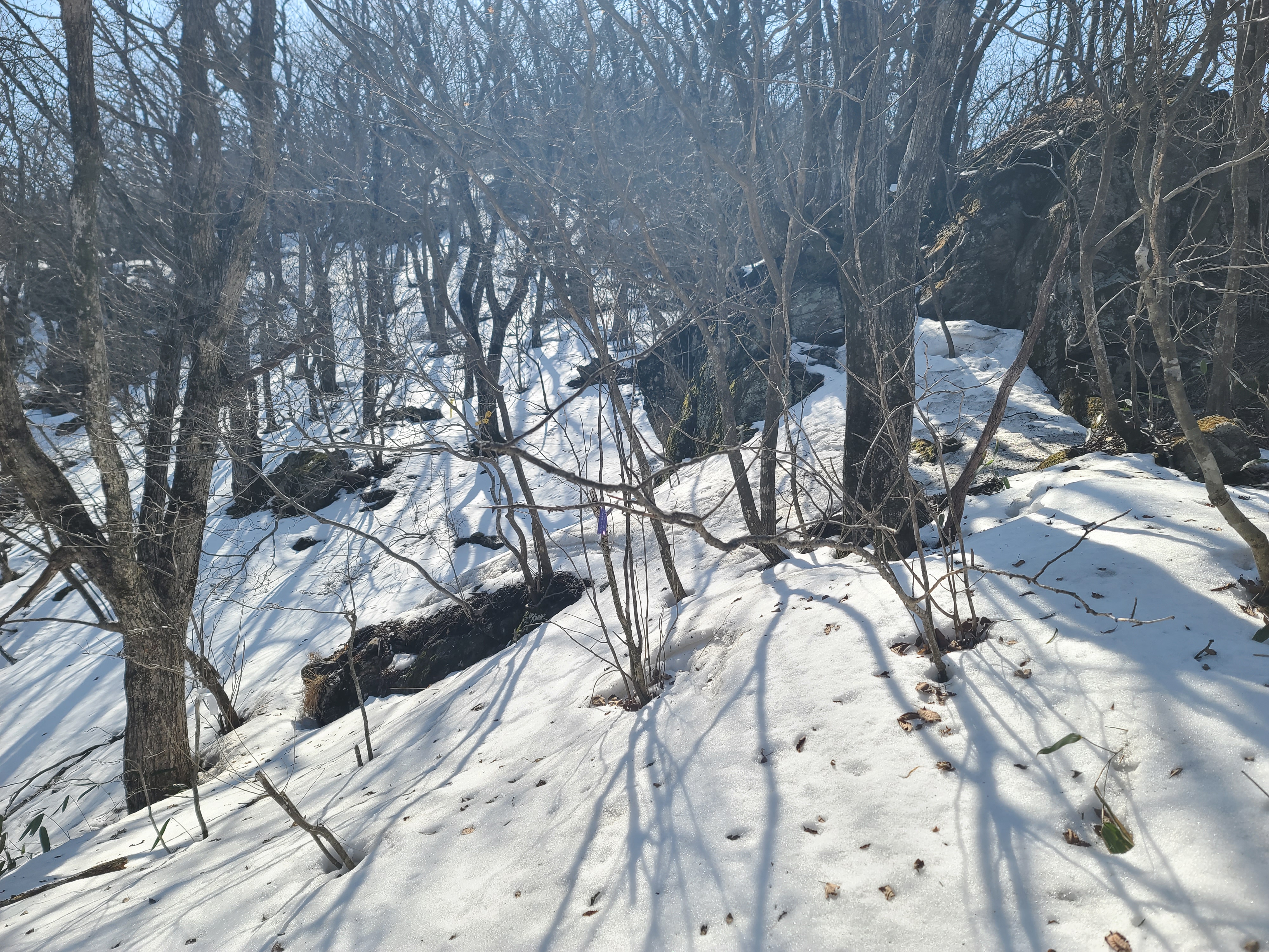 길이 안 보이는 꽤 가파른 사면이다. 눈 아랜 얼음이라 체인젠이 박히지 않고 미끌려서 약간 겁이 났다. 표식천도 잘 안 보이고 이 길이 맞나 하며 올라가니